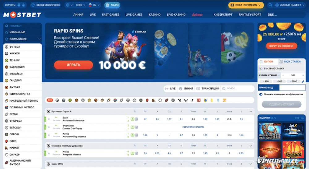 Главная страница сайта оформлена в привычном стиле: в центре расположен блок с ротацией баннеров, где отображаются актуальные акции, приветственные бонусы и предложения по фриспинам. Здесь же можно скачать мобильное приложение Mostbet для Android и iOS, связаться со службой поддержки или перейти к ставкам на спорт и разделу «Казино» со слотами и live-играми.